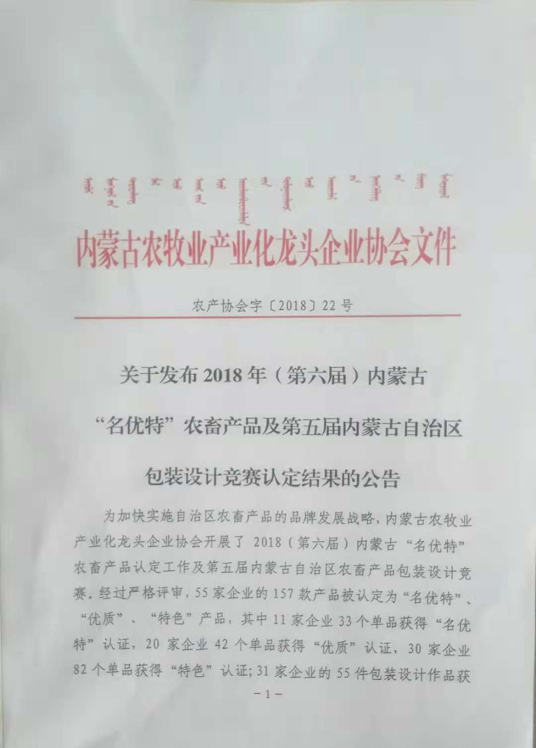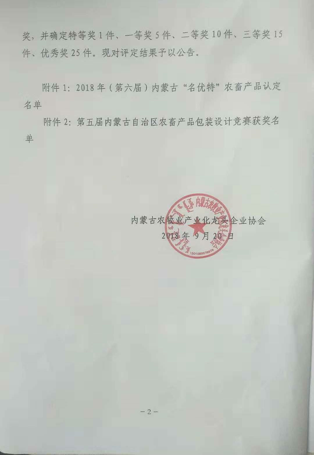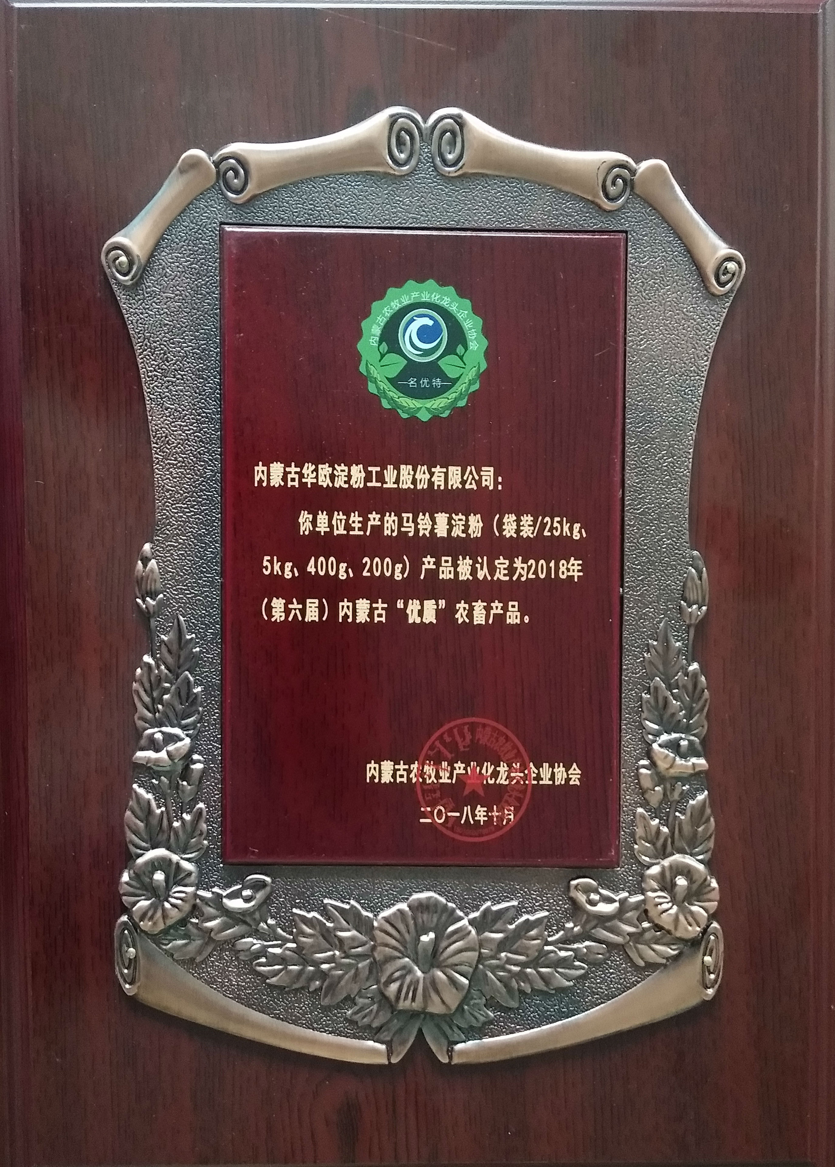 为加快实施自治区农畜产品的品牌发展战略,内蒙古农牧业产业化龙头企业协会开展了2018(第六届)内蒙古“名优特”农畜产品认定工作及第五届内蒙古自治区农畜产品包装设计竞赛。2018年9月20日,我公司产品—马铃薯淀粉经过严格评审,获得“优质”认证。